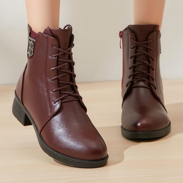 Winter women’s short boots comfortable square heel shoes lace up leather soft leather middle-aged snow boots ladies Martin boots