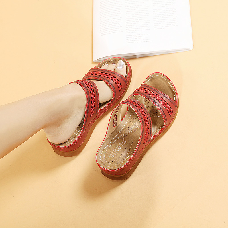 Women’s Summer Leather Open Toe Casual Slippers Woman Soft Bottom Beach Slip On Sandals Mother Wedges Slippers free shipping