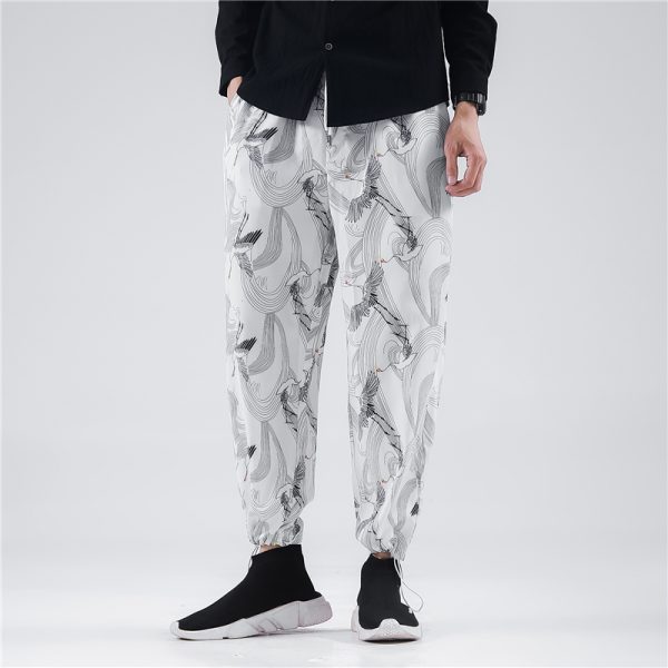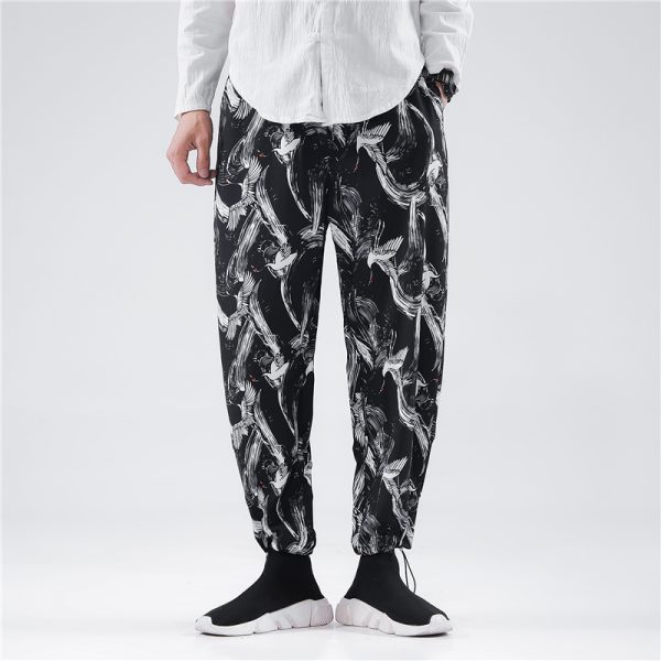 Men Printed Chinese Style Summer Casual Pants Mens Cotton Wide Leg Loose Trousers Male Oversize Calf-Length Pants